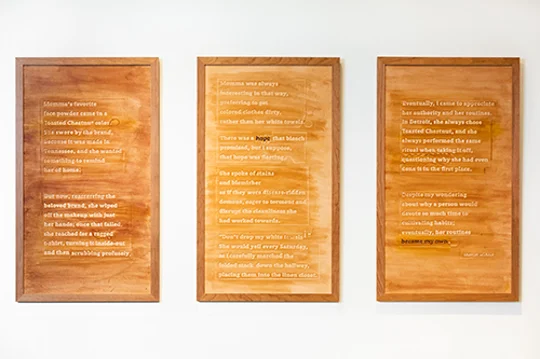 Shavon Aja Morris(opens in new window) initially proposed her poetic triptych Framework, for example, as a work on paper. The text is from a story she wrote, told from the point of view of a daughter recalling her mother’s beauty ritual. The narrator details how her mother favored a particular brand of face powder because it was made near her home, also describing how she scrubbed off the chestnut-colored makeup with ragged T-shirts, preferring to dirty her colored clothes rather than her white towels. “There was a hope that bleach promised,” Morris wrote, “but I suppose that hope was fleeting.”