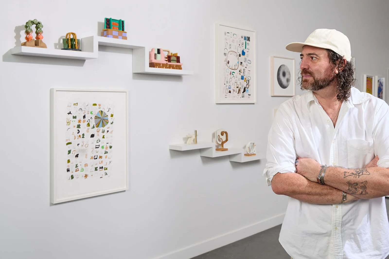 Pitt’s works are modest in scale, richly tactile, and quietly animated, carrying a sense of intimacy and familiarity. What may read as abstraction to us is, for Pitt, a direct transcription of what he sees. After a car accident and severe traumatic brain injury, he no longer perceives depth. Space is flattened to a single plane. As a faculty member at California College of the Arts at the time of the injury, and with no real recovery resources, Pitt turned to the disciplines of teaching and studio work to rebuild and steady his memory and language. That commitment has become a ritual pursuit of giving form to fleeting sensations. The two works on paper in the exhibition, with rows of small glyphs and diagrams, read like a journal of accumulated impressions. The early painted-wood sculptures from 2009, made from found materials, feel raw and intuitive, while the 2021 sculptures grow more architectural and playful with the introduction of bright ceramics. What may feel emblematic to us, hovering just above the familiar, is, for Pitt, a portal rather than a symbol. His works are a literal record shaped through resilience and ingenuity, giving us a direct glimpse into his hard-won and singular way of seeing.