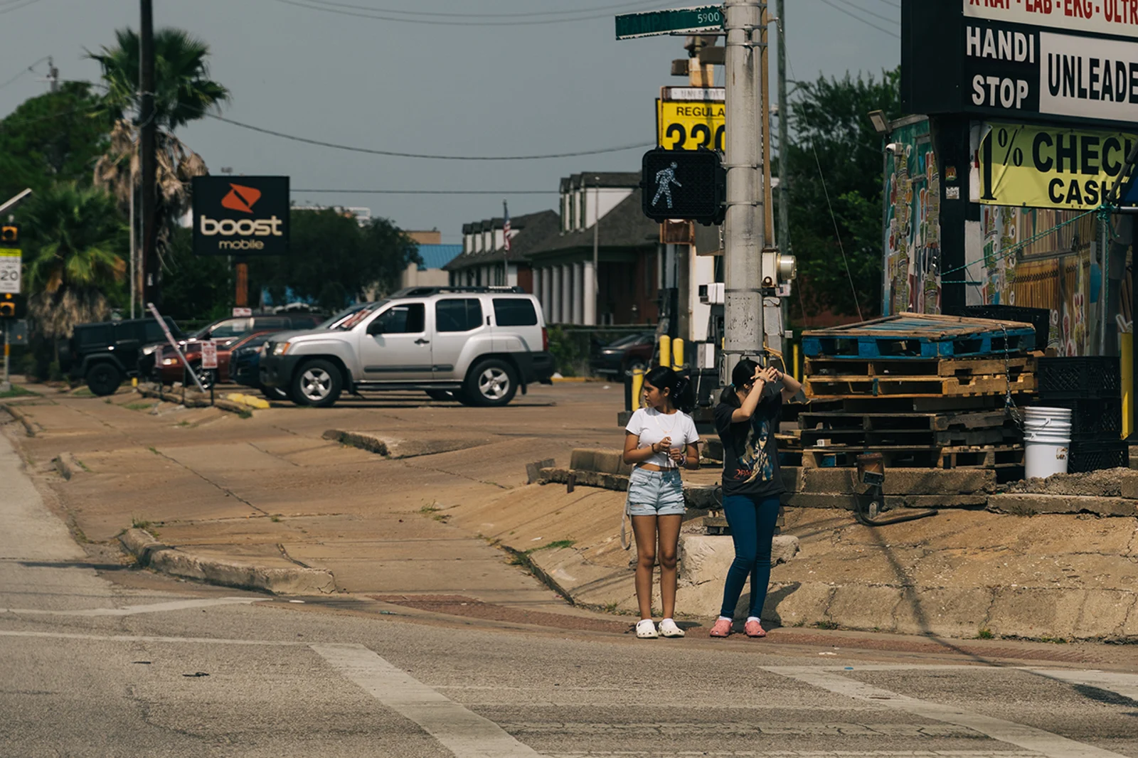 Pedestrians cross Gulfton Street in direct sunlight on Tuesday, Aug. 1, 2023, in Houston. (Photo by Joseph Bui for Houston Endowment)