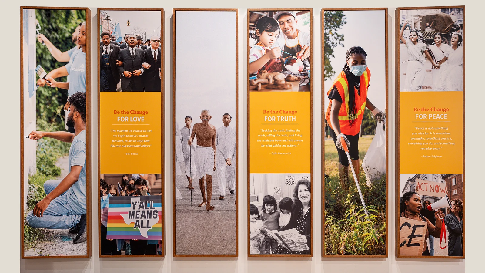 The final gallery in the Eternal Gandhi Museum completes the circle. The space is one for reflection and inspiration as visitors are urged to commit themselves to creating positive and peaceful change in their communities. They are urged to leave the museum and go back into the world inspired to make it better. To be, as Gandhi encouraged, the change they wish to see.