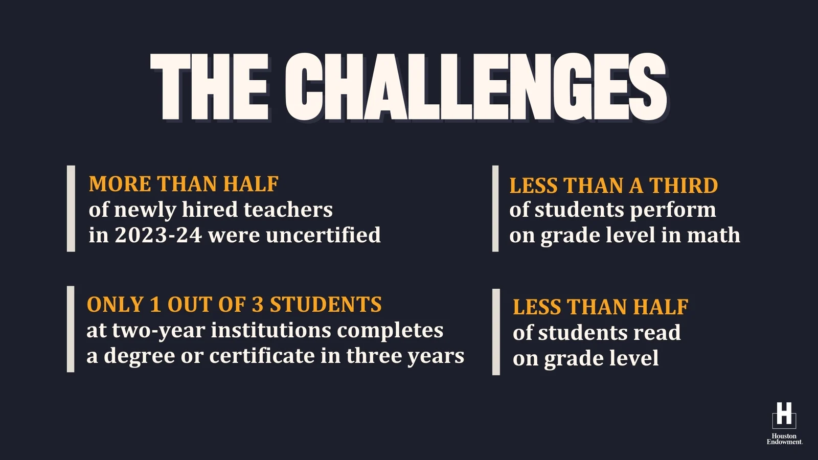 The Houston region’s demand for teachers is the highest in the state, employing 82,000 educators — more than Louisiana and Mississippi combined. School districts struggle to recruit and retain teachers who are fully prepared for the classroom. Meanwhile, student achievement is falling short: Fewer than half of third-grade students are reading on grade level, and less than a third are proficient in math. And too many young people leave high school without a clear path to post-secondary success, limiting their future opportunities.